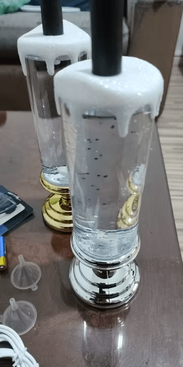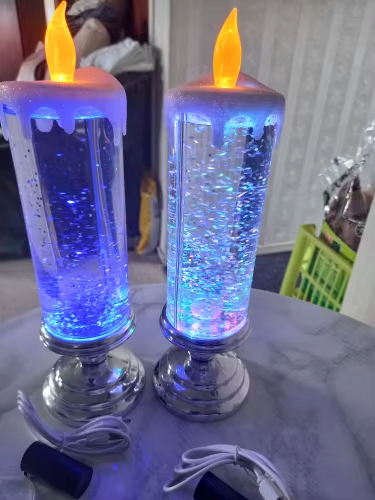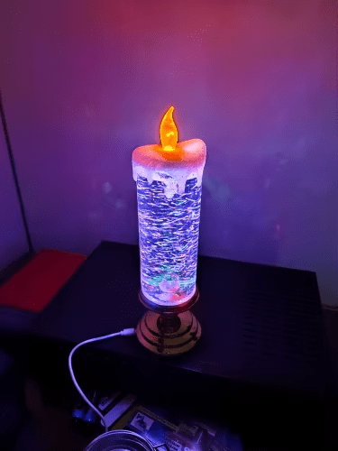 When the candle is lit, the sparkling liquid swirls and the LEDs change color automatically.